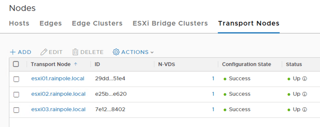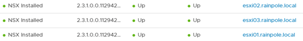 Under the “Transport Nodes” tab I see that the three ESXi hosts have been successfully configured as transport nodes: