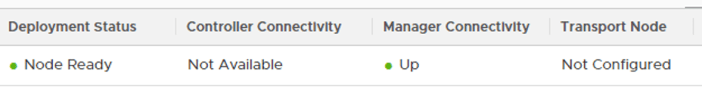 The manager connectivity is up and running which is good. I still need to configure this Edge VM as a transport node before it can participate in actual NSX networking.