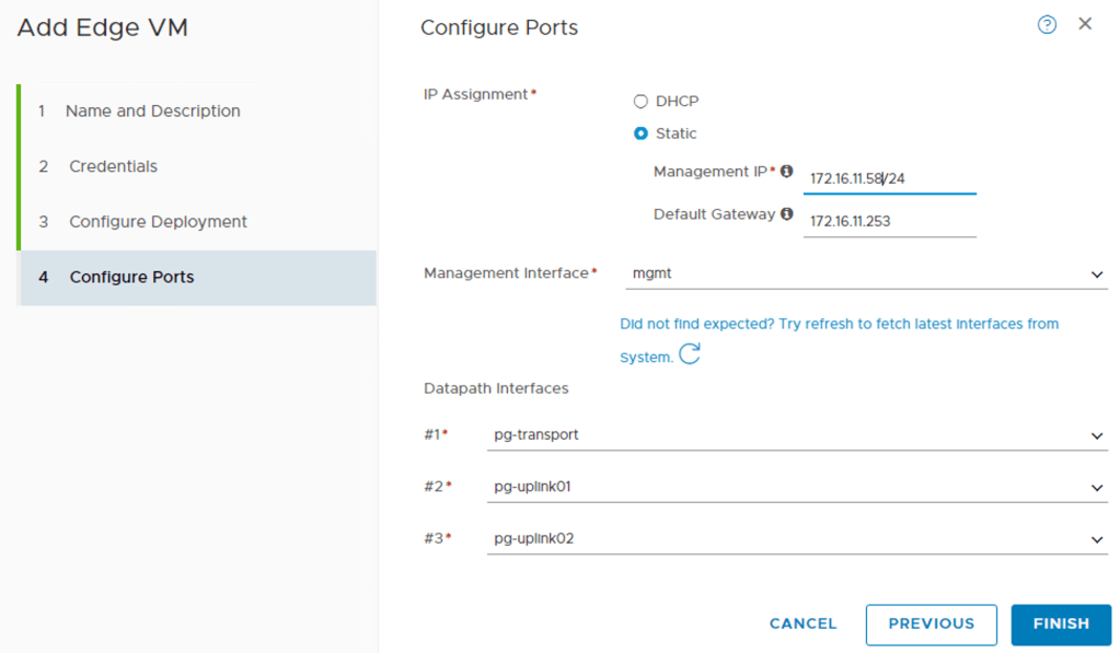 First I specify the IP address, gateway, and port group for the Edge VM’s management interface. Then I configure the three so called “datapath” interfaces. These are the Edge VM’s interfaces that will be part of the data plane. I’m assigning interface #1 to the “pg-transport” port group, interface #2 to the “pg-uplink01” port group, and interface #3 to the “pg-uplink02” port group.