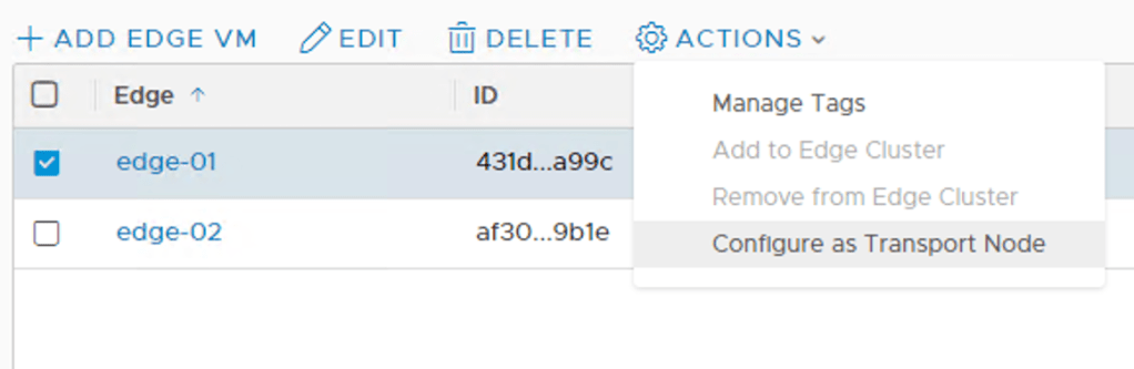 I select edge-01, click the “Actions” button, and choose “Configure as Transport Node”: