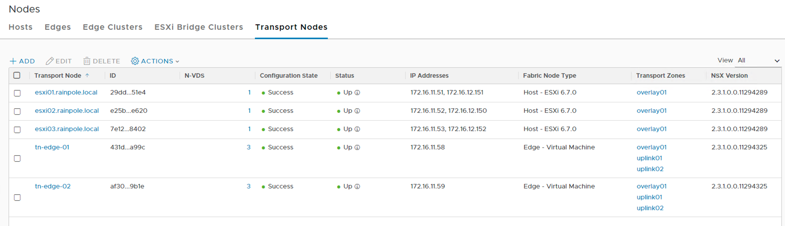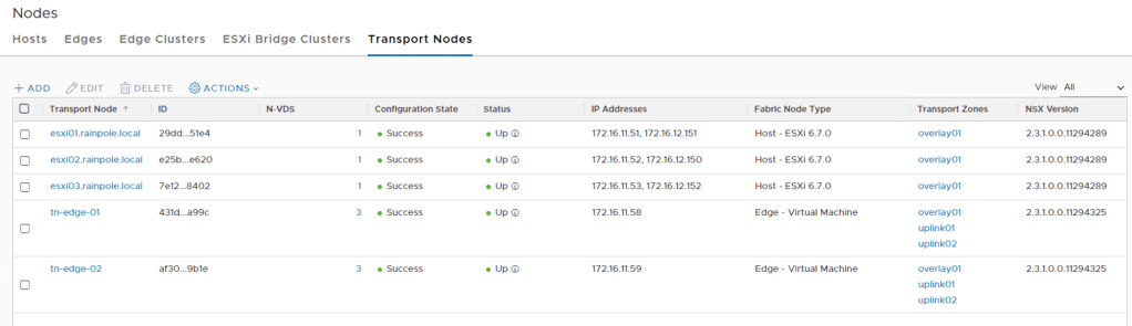 Looking under Fabric > Nodes > Transport Nodes I see five transport nodes. Three ESXi hosts and two Edge VMs: