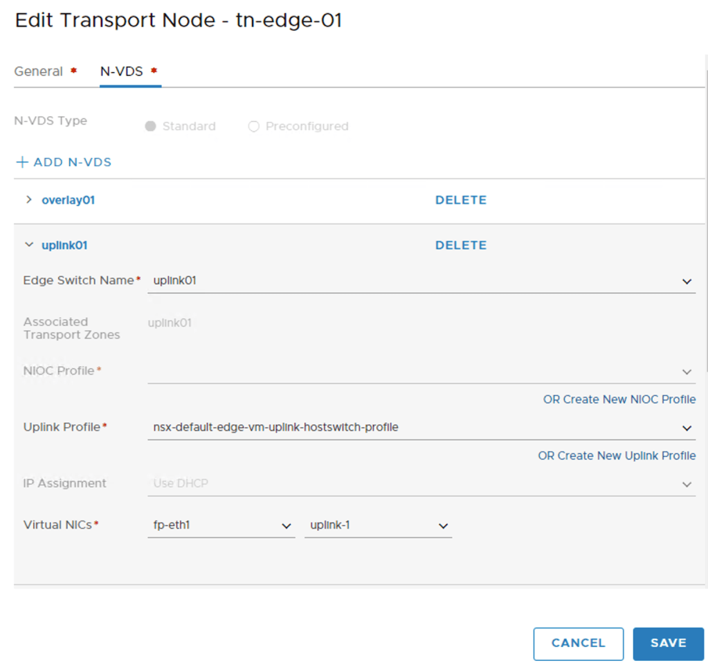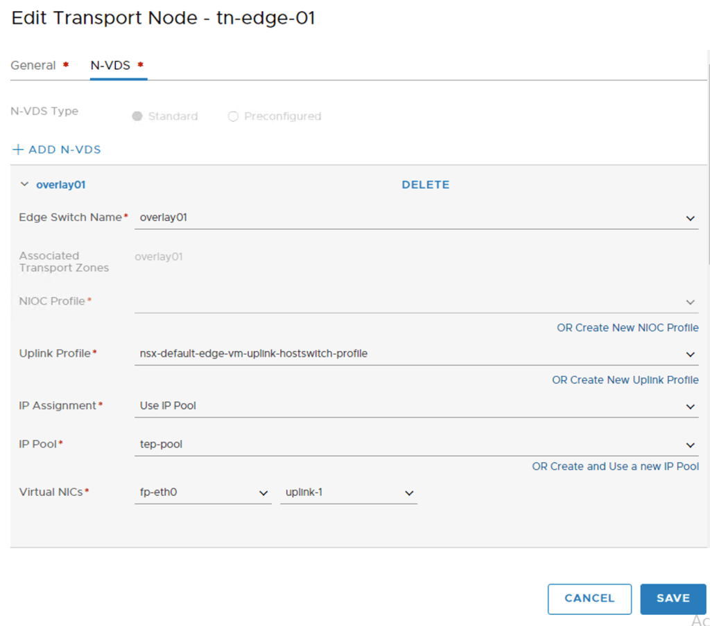 I’m using the “nsx-default-edge-vm-uplink-hostswitch-profile” and the “tep-pool” IP pool to assign an IP address to the TEPs. Datapath virtual NIC “fp-eth0” is mapped to “uplink-1”.