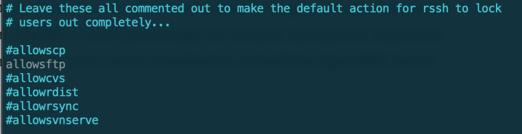Accounts using the rssh shell should be allowed to login via SFTP and SFTP only. So we need to uncomment allowsftp. Save the file when done.