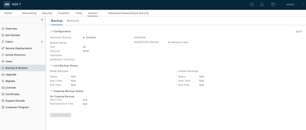 The NSX-T backup can be configured in the NSX Manager UI or via the API. Let’s have a look at both.
