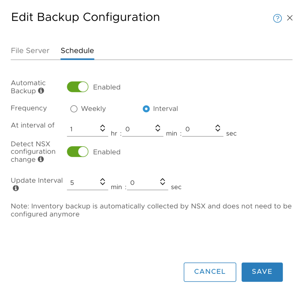 Enable Automatic Backup and adjust the interval according to your requirements. Optionally you can enable Detect NSX configuration change which triggers a full backup each time a configuration change is detected by NSX Manager.