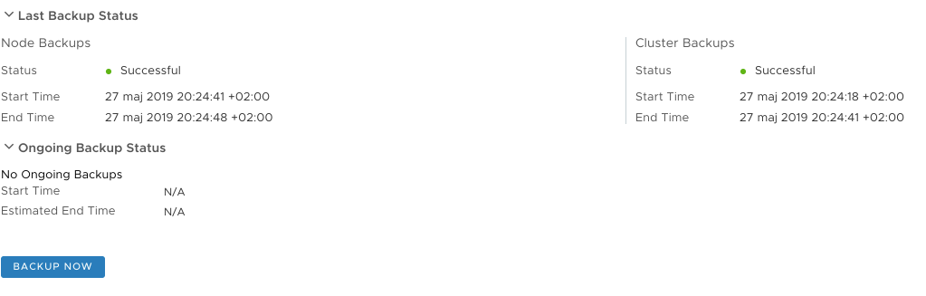 After hitting the Save button a backup process is fired off immediately which gives us the opportunity to verify that everything is working. Hopefully node and cluster backups are successful: