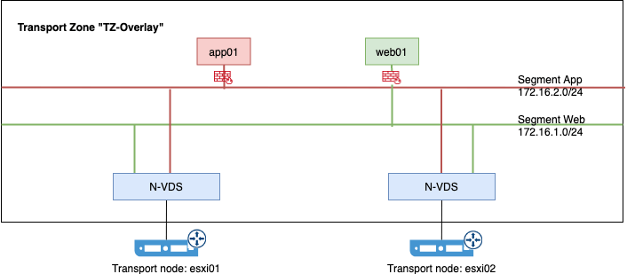 A simple setup. Two ESXi hosts participating in logical NSX-T networking. Two segments each with a virtual machine connected. The two segments are linked to the same distributed logical router which is a Tier-1 gateway in my environment.