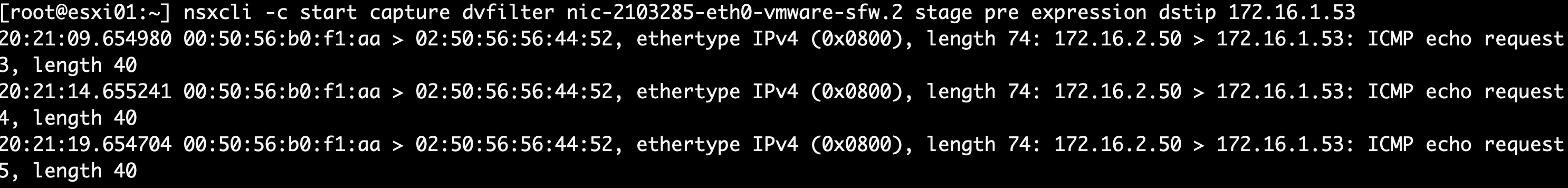 nsxcli -c start capture dvfilter nic-2103285-eth0-vmware-sfw.2 stage pre expression dstip 172.16.1.53