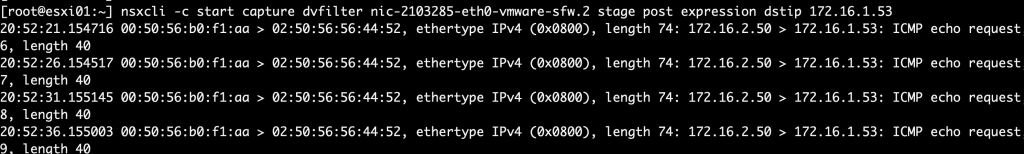 nsxcli -c start capture dvfilter nic-2103285-eth0-vmware-sfw.2 stage post expression dstip 172.16.1.53