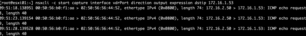 nsxcli -c start capture interface vdrPort direction output expression dstip 172.16.1.53
