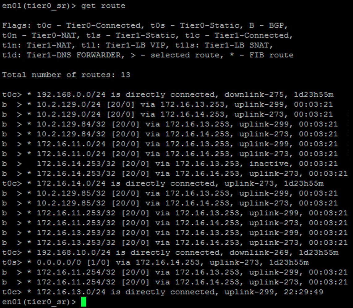 The Tier 0 gateway’s routing table contains IP routes advertised by the TORs through BGP.