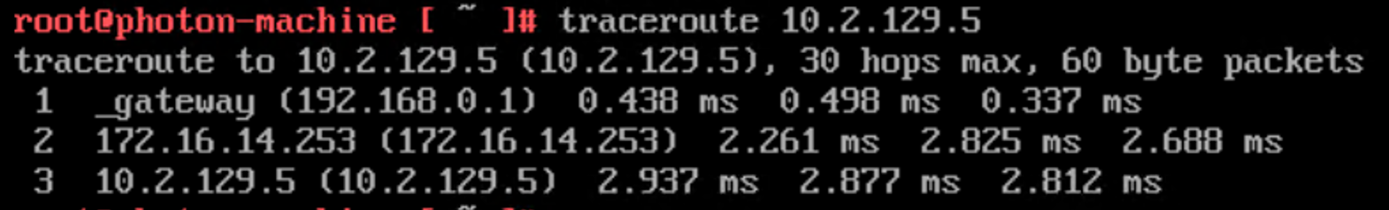 And last but not least the VM in the compute cluster can access the physical network. A “traceroute” to the PING host on the physical network shows that traffic is routed to TOR-Right (172.16.14.253) at the moment:
