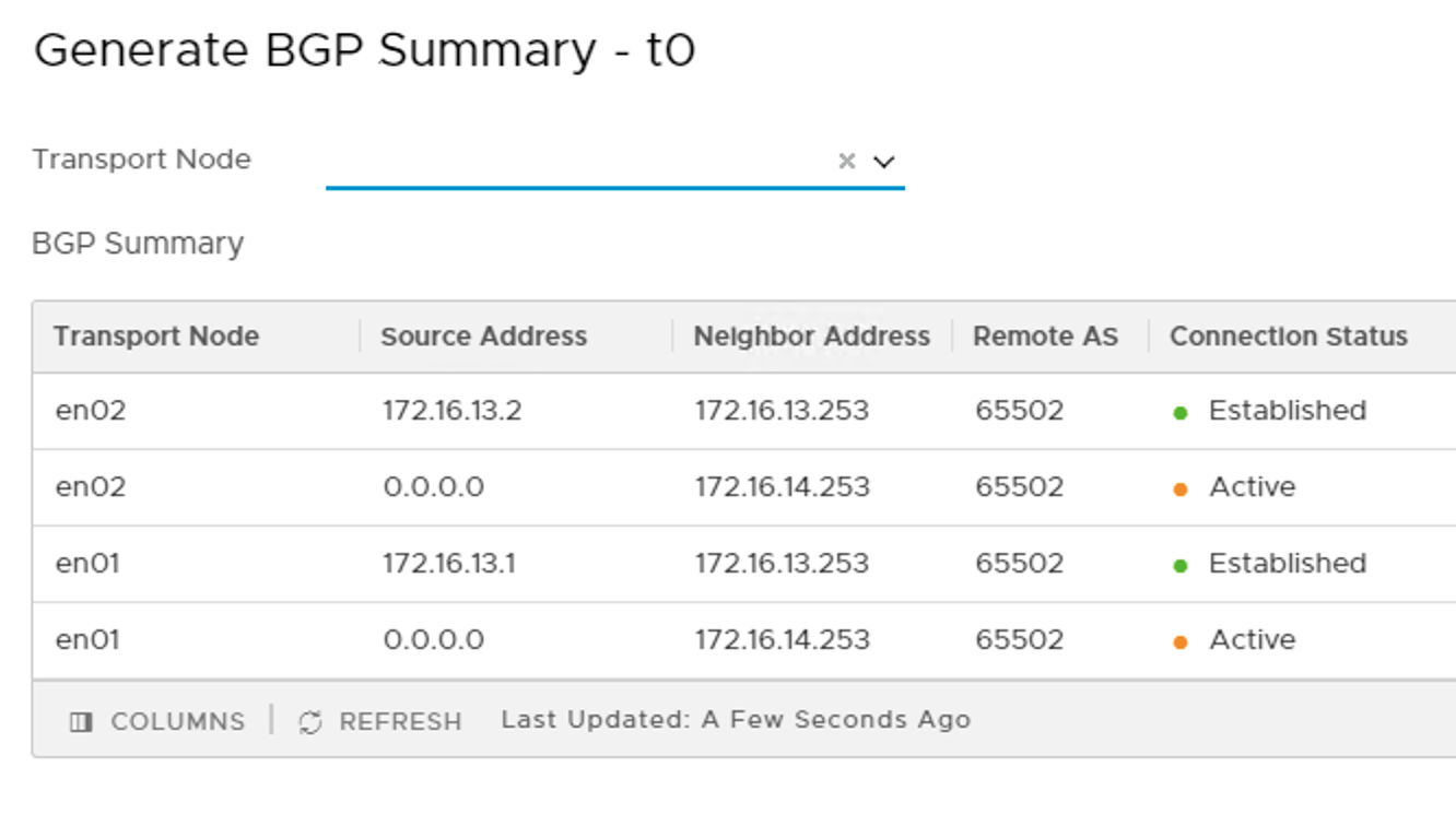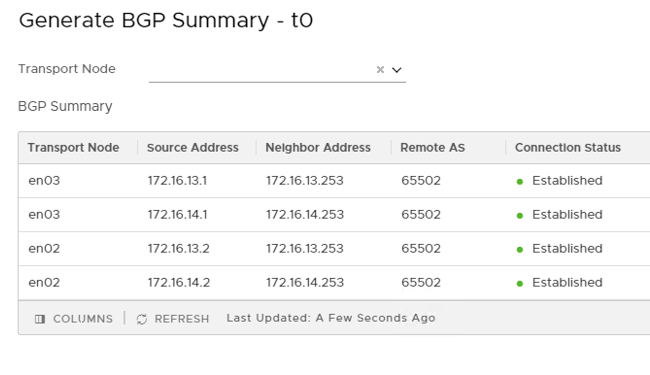 The Tier 0 gateway’s BGP summary shows that BGP connections are established with both of the TORs.