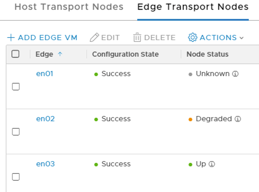 Once the process is done we can delete the orphaned edge transport node and after a minute or so we’re seeing two healthy edge transport nodes again.