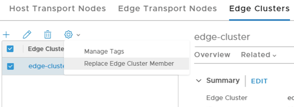 The second step is to tell the management plane that we want to replace the missing edge transport node with the one we just deployed.