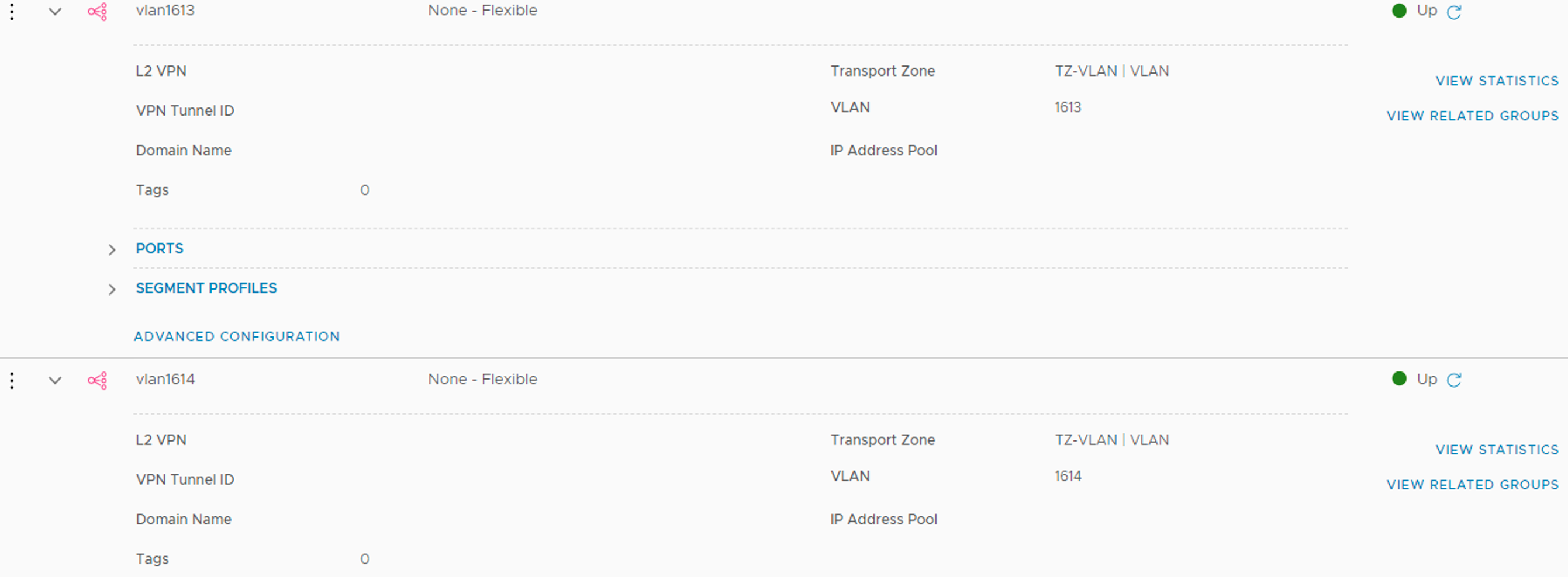 I create two new segments called vlan1613 and vlan1614 and configure them with VLAN ID 1613 and 1614 respectively: