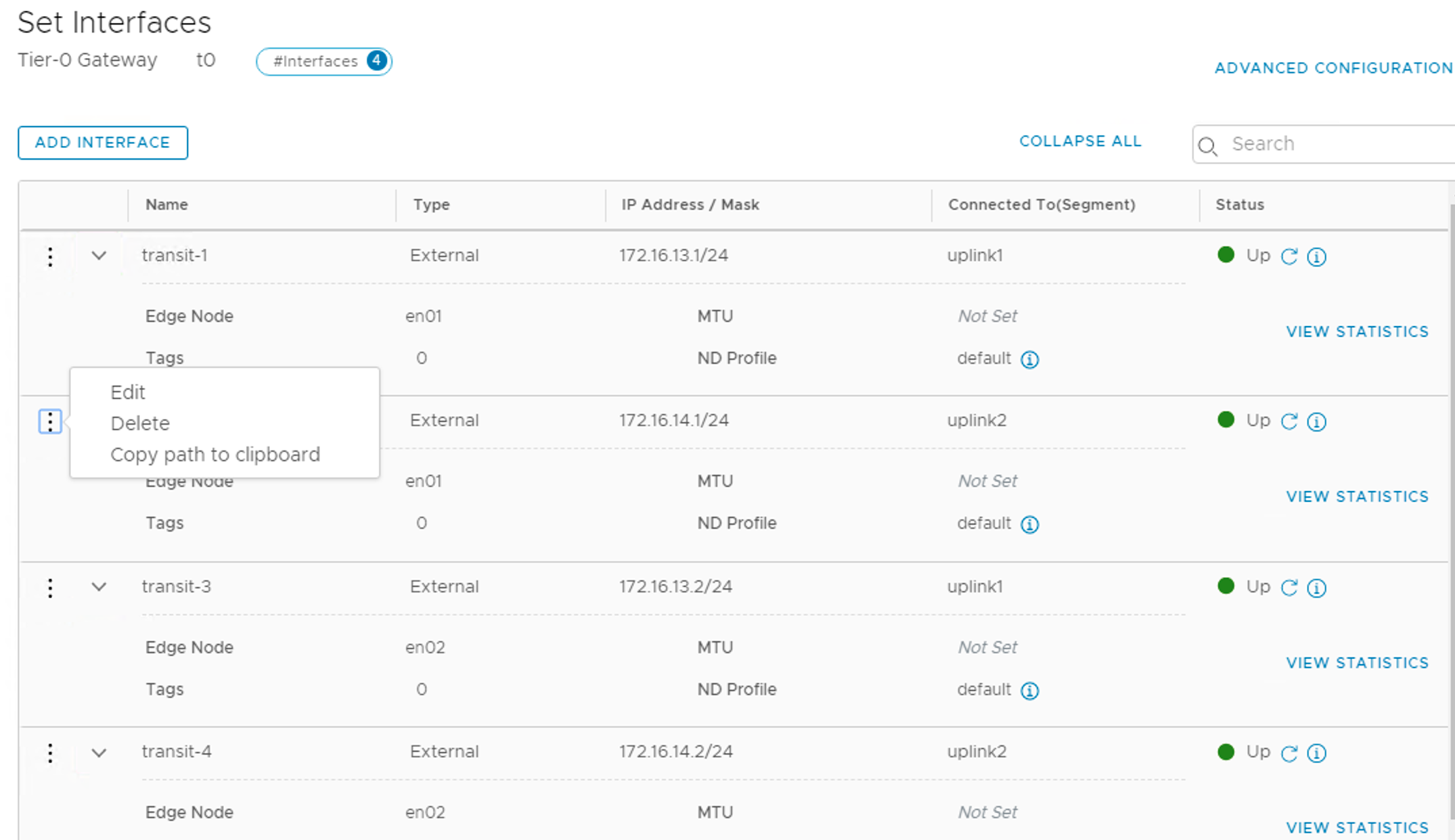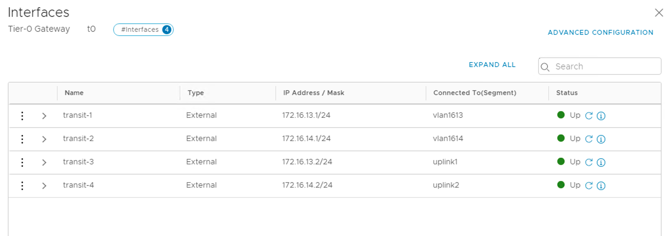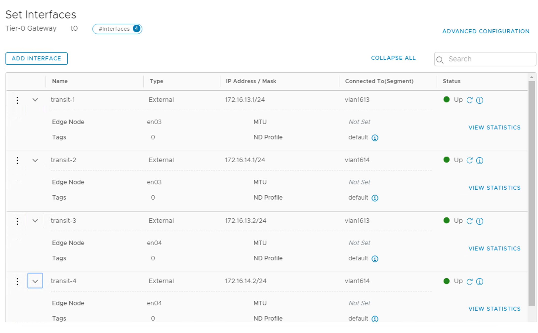 The final result is four Tier 0 gateway interfaces with the same name and IP as before, but linked to the new Edge transport nodes: