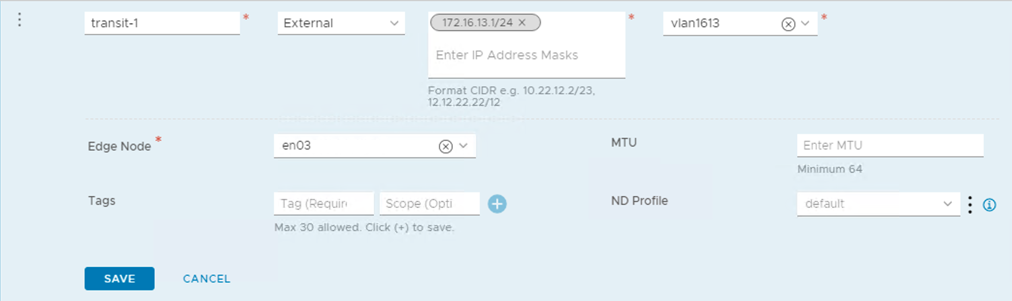 - Add Tier 0 interfaces, link them to en04 and select the new segment