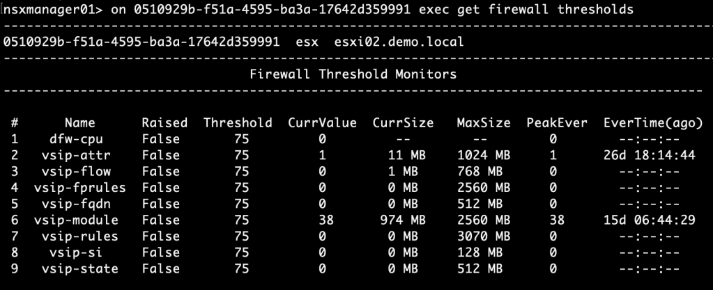 A similar command can be used from an NSX Manager node: “on <transport-node-id> exec get firewall thresholds“.