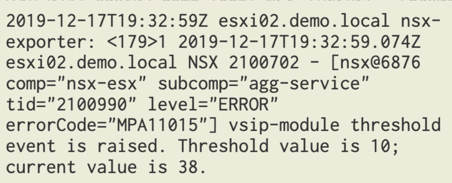 A quick look at a DFW threshold event. We see things like the transport node, the DFW component that crossed the threshold, as well as the configured threshold and the current usage.