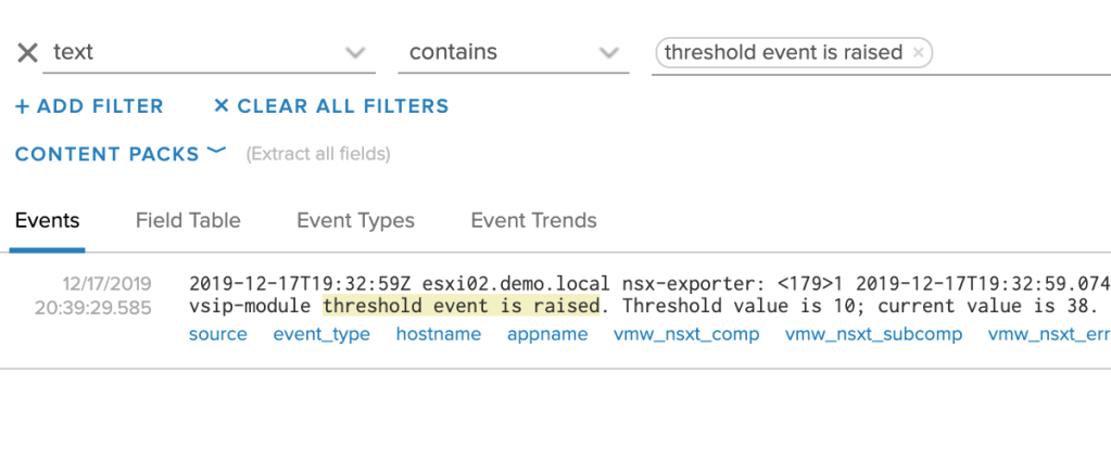 Luckily there’s always vRealize Log Insight. Configured as a syslog target for the NSX-T platform, DFW threshold events end up there too: