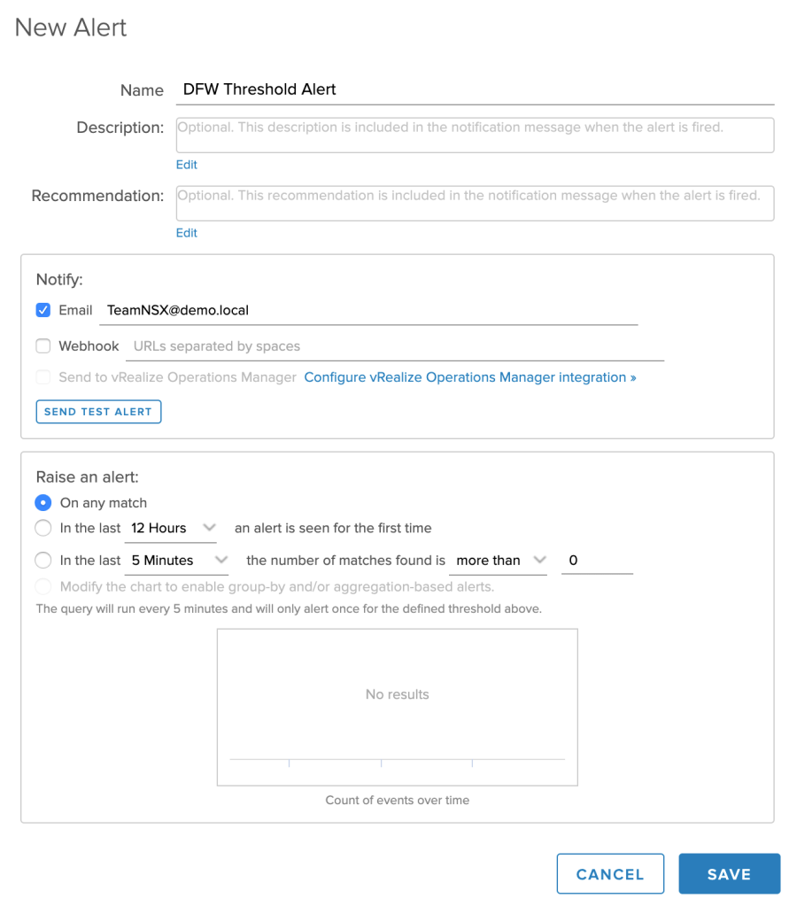 Now that we know what a threshold event looks like, it’s easy to configure an alert based on the query in vRLI: