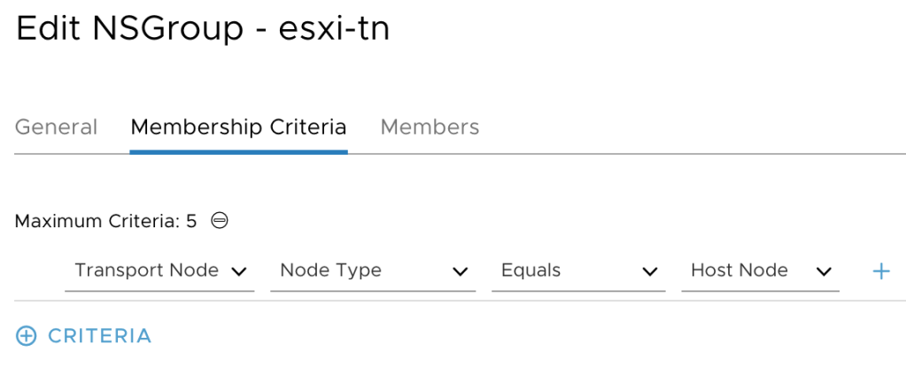 NSGroups are managed under Advanced Networking & Security > Inventory > Groups. I’m creating an NSGroup called “esxi-tn” with a membership criteria that will add all the host transport nodes as members: