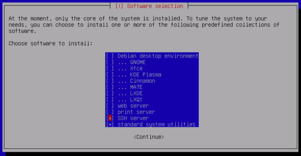 The only additional components we need to install are the SSH server and standard system utilities: