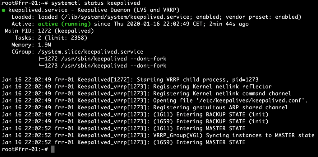 We can now verify VRRP operation by running systemctl status keepalived: