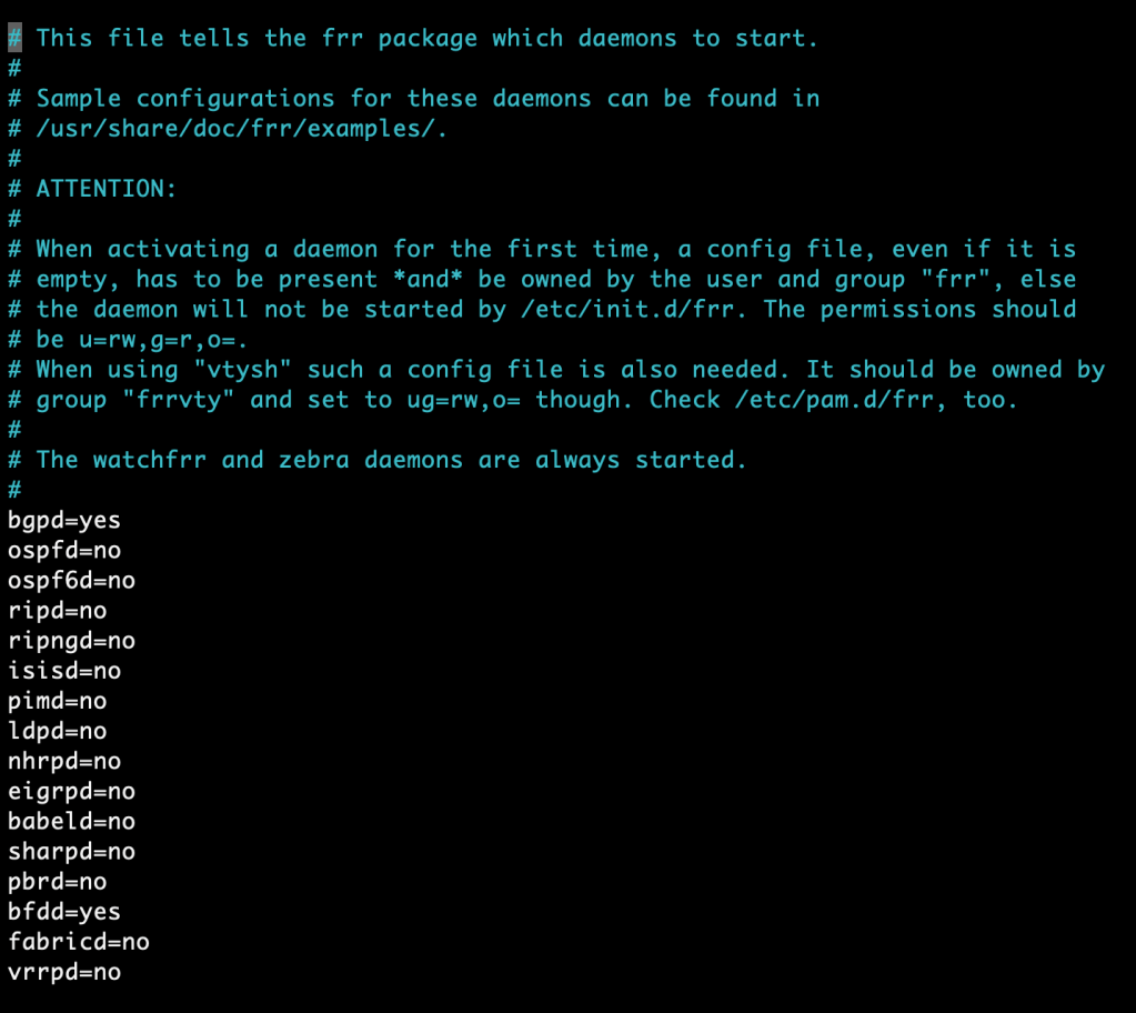 We only enable the routing protocols that are needed. To make FRR a good match for the NSX-T Edge we would like the instances to be capable of doing BGP and BFD. So we simply enable these daemons in /etc/frr/daemons.