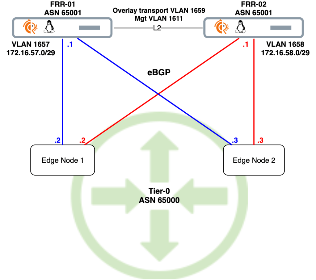 The FRR routers, frr-01 and frr-02, were configured with local “peering” VLANs 1657 and 1658 respectively. Corresponding VLAN-backed segments are needed for L2 adjacency with the FRR routers.