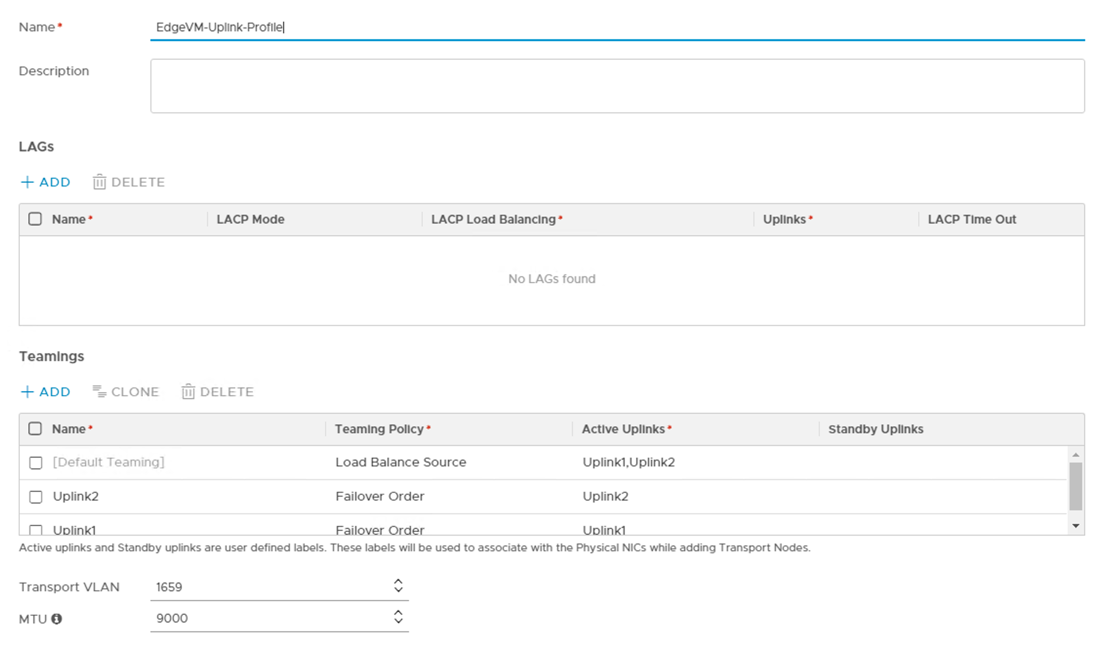 Create an uplink profile for the edge transport nodes containing settings for teamings, transport VLAN, and MTU: