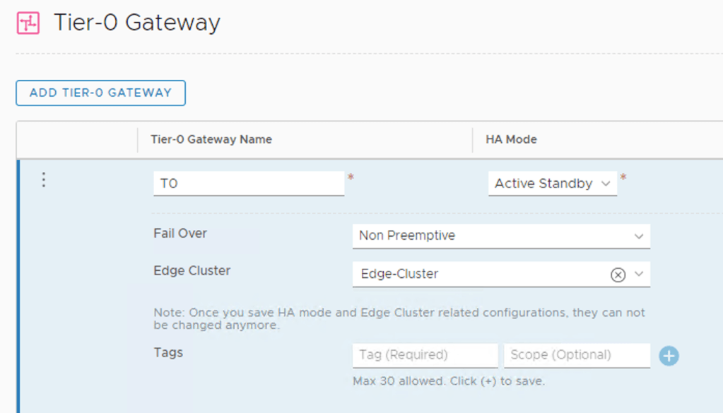 With the Edge nodes in place we can create a Tier-0 gateway. I’m configuring it with Active-Standby HA Mode: