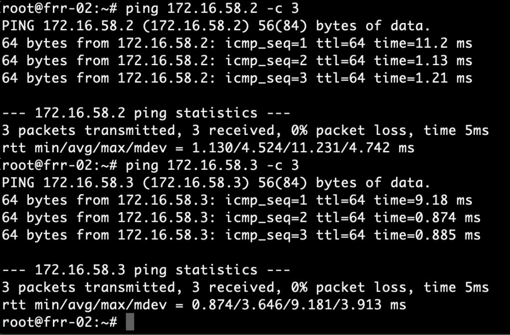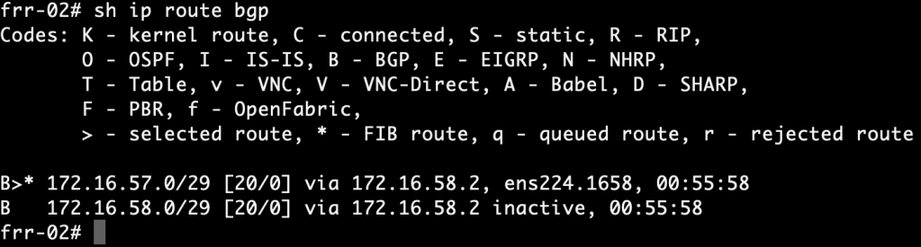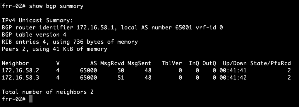 We repeat the exact same configuration steps on frr-02. The configuration for frr-02 looks like this: