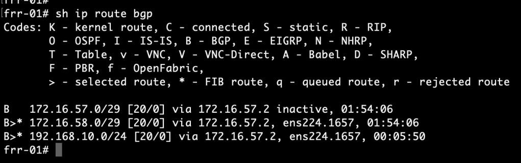 We begin by having a look at the FRR routing tables. Run the following command in VTY shell on the FRR routers: