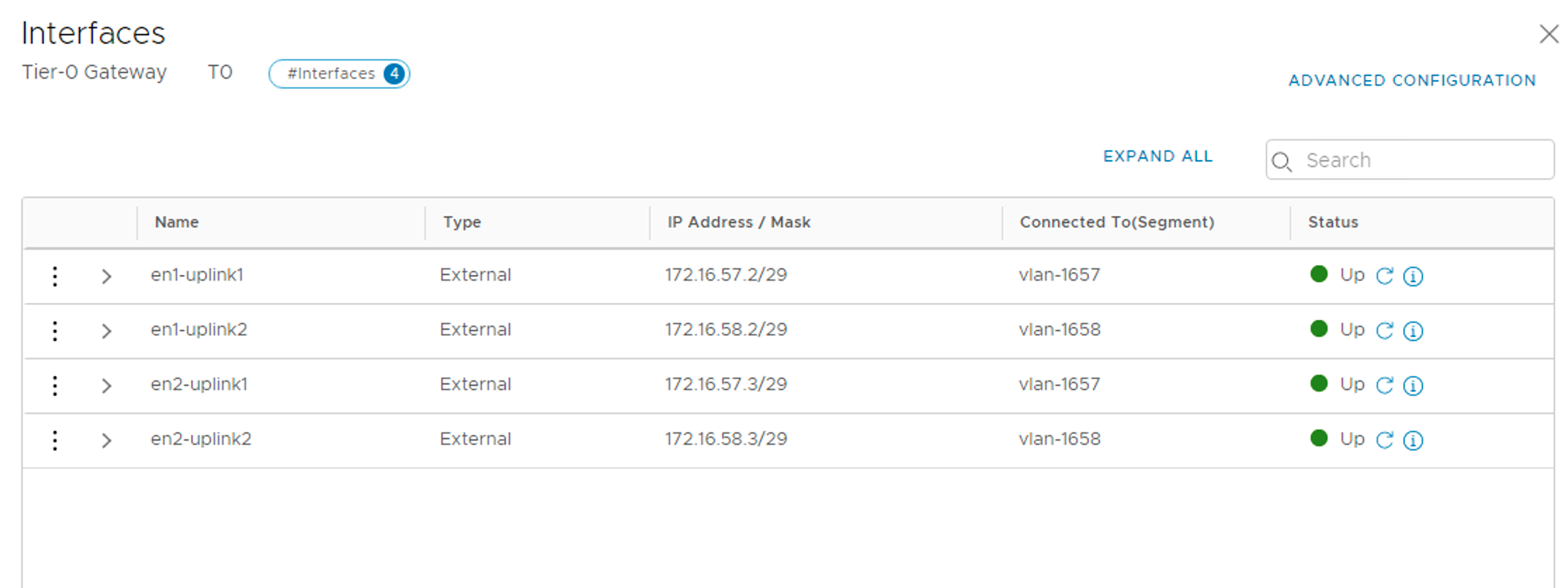 | en1-uplink1 | 172.16.57.2/29 | vlan-1657 | en1 |