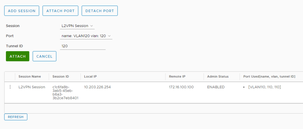 The last step is to attach these ports to the L2 VPN session. Click L2VPN > Attach Port. We select the session, the port, and configure a Tunnel ID that matches the VLAN ID. Click Save.