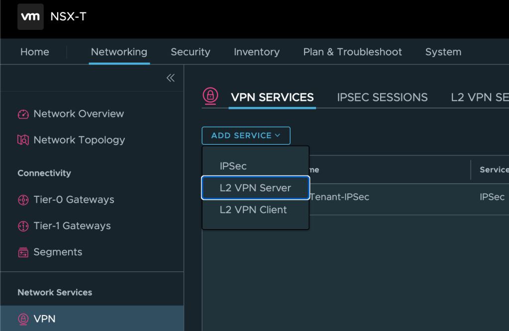 First we need to add an IPSec Service, which is the underlying protocol for the L2 VPN connection. IPSec services can be managed from the NSX Manager UI under Networking > Network Services > VPN. Here we click on Add Service > IPSec: