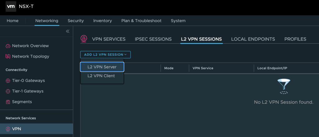 We can now configure the L2 VPN Server Session itself. L2 VPN Server sessions are managed under L2 VPN Sessions. Click on Add L2 VPN Session > L2 VPN Server: