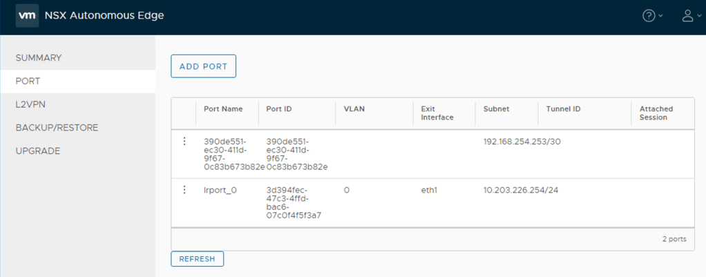 Time to extend the customer’s VLANs into the L2 VPN tunnel. In the NSX Autonomous Edge UI click on Port > Add Port