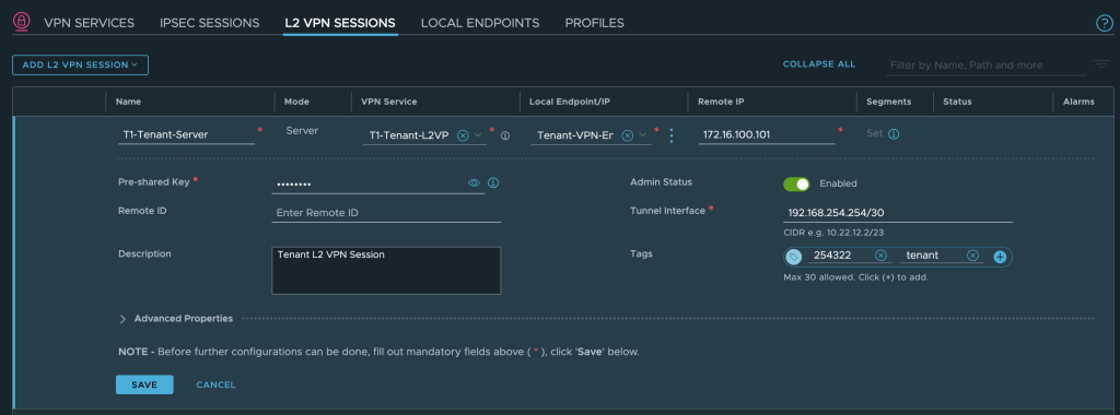 We enter a name, select the L2 VPN service, and the local endpoint. We must also specify the remote IP address which is the IP address that we configured on the uplink interface of the customer’s NSX Autonomous Edge (10.203.226.254). A valid CIDR for the tunnel interface is required as well: