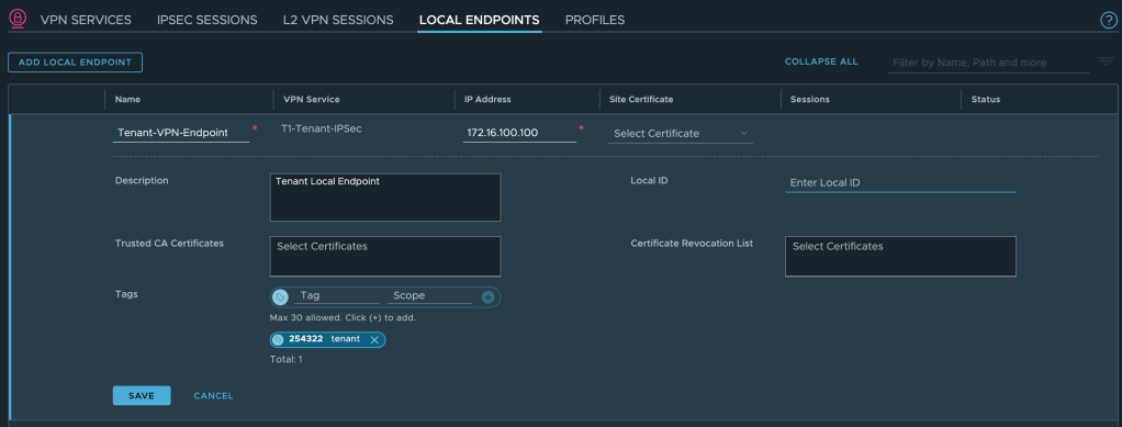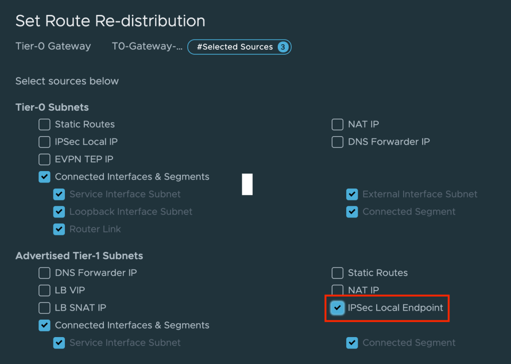 On the service provider’s Tier-0 Gateway we enable re-distribution of Tier-1 Gateway IPSec Local Endpoints: