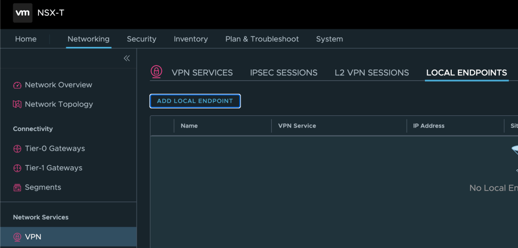 A local VPN endpoint is required and must be advertised throughout the network. Click on Local Endpoints > Add Local Endpoint: