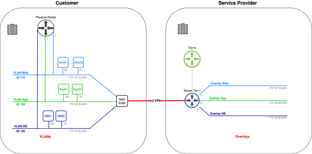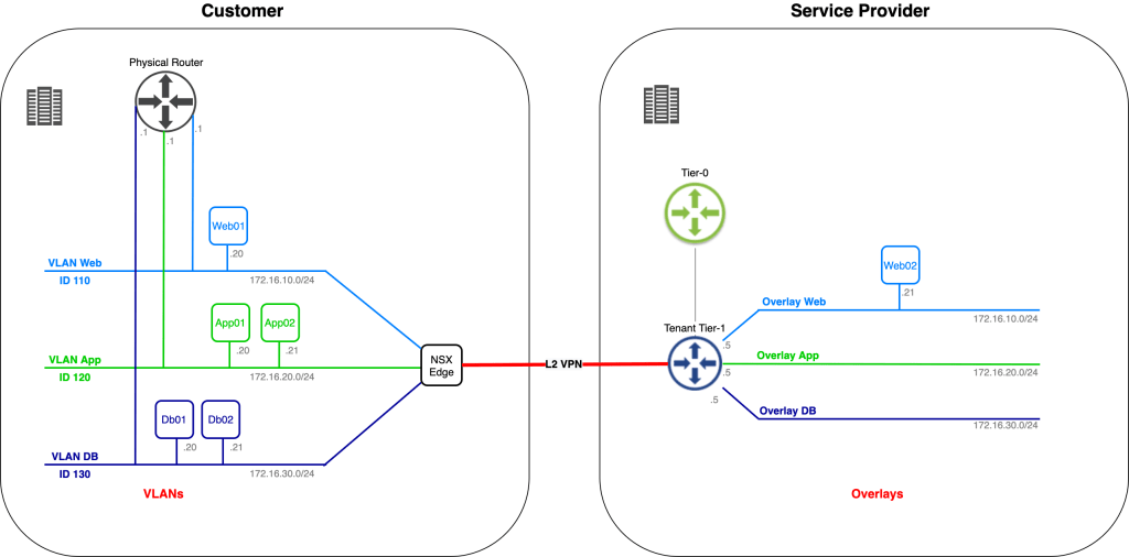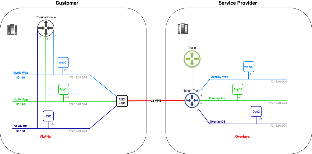 In this article we’re going to have a look at another method to facilitate migration of workloads from VLAN to NSX-T overlay when source and destination environment are different data centers and different administrative entities. By leveraging layer-2 VPN a customer will migrate their VLAN-connected application to a service provider’s NSX-T overlay. We have a lot to do so no time to waste!