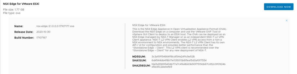 Strange enough, our customer has not implemented NSX-T in their environment. Fortunately, we can deploy a standalone NSX Edge appliance that will act as the L2 VPN client. This standalone NSX Edge appliance can be downloaded as an OVA package from VMware: