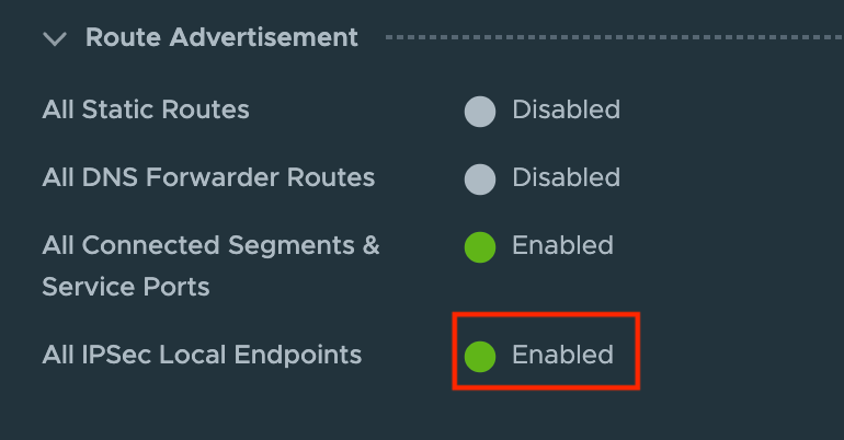 To advertise this local VPN endpoint throughout the network, we enable a Route Advertisement on the customer’s Tier-1 Gateway: