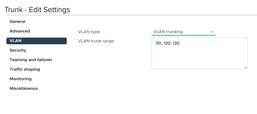 The “Trunk” port group is configured to carry VLANs 110 (Web), 120 (App), and 130 (DB):