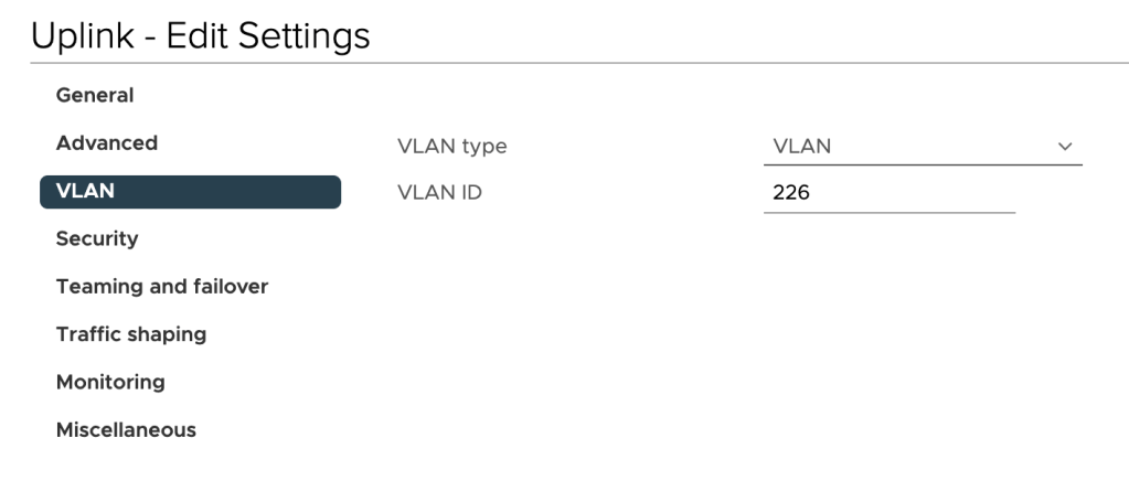 The “Uplink” port group should be mapped to a VLAN that can route traffic to the service provider’s L2 VPN endpoint. In our scenario the customer has allocated VLAN 226 for the purpose: