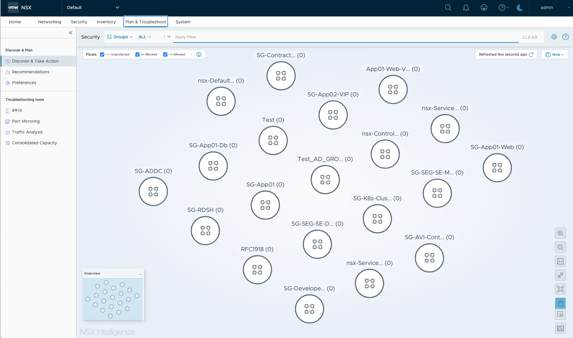 With the feature active we can start using NSX Intelligence for the automatic mapping and analytics of network communication flows. The module is found in the NSX Manager UI under Plan & Troubleshoot > Discover & Take Action: