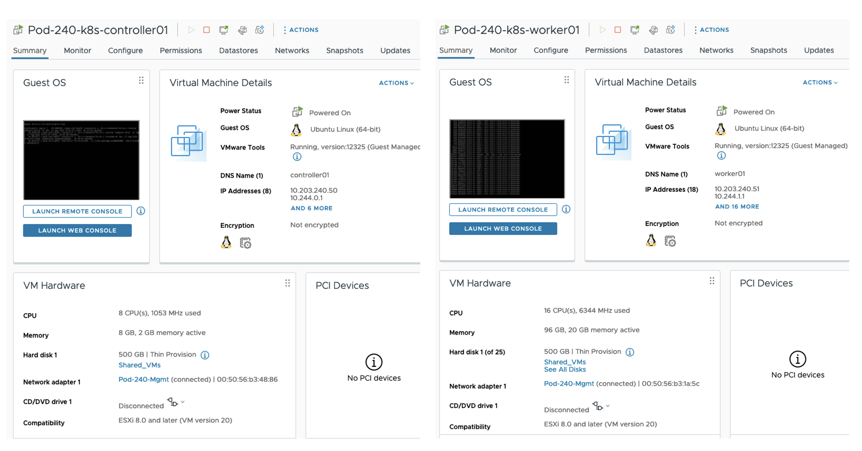 Installing Kubernetes on Ubuntu 22.04 involves relatively many steps (when not automated) but is rather straightforward and well documented. In my case I deployed two Ubuntu virtual machines with the following specifications: